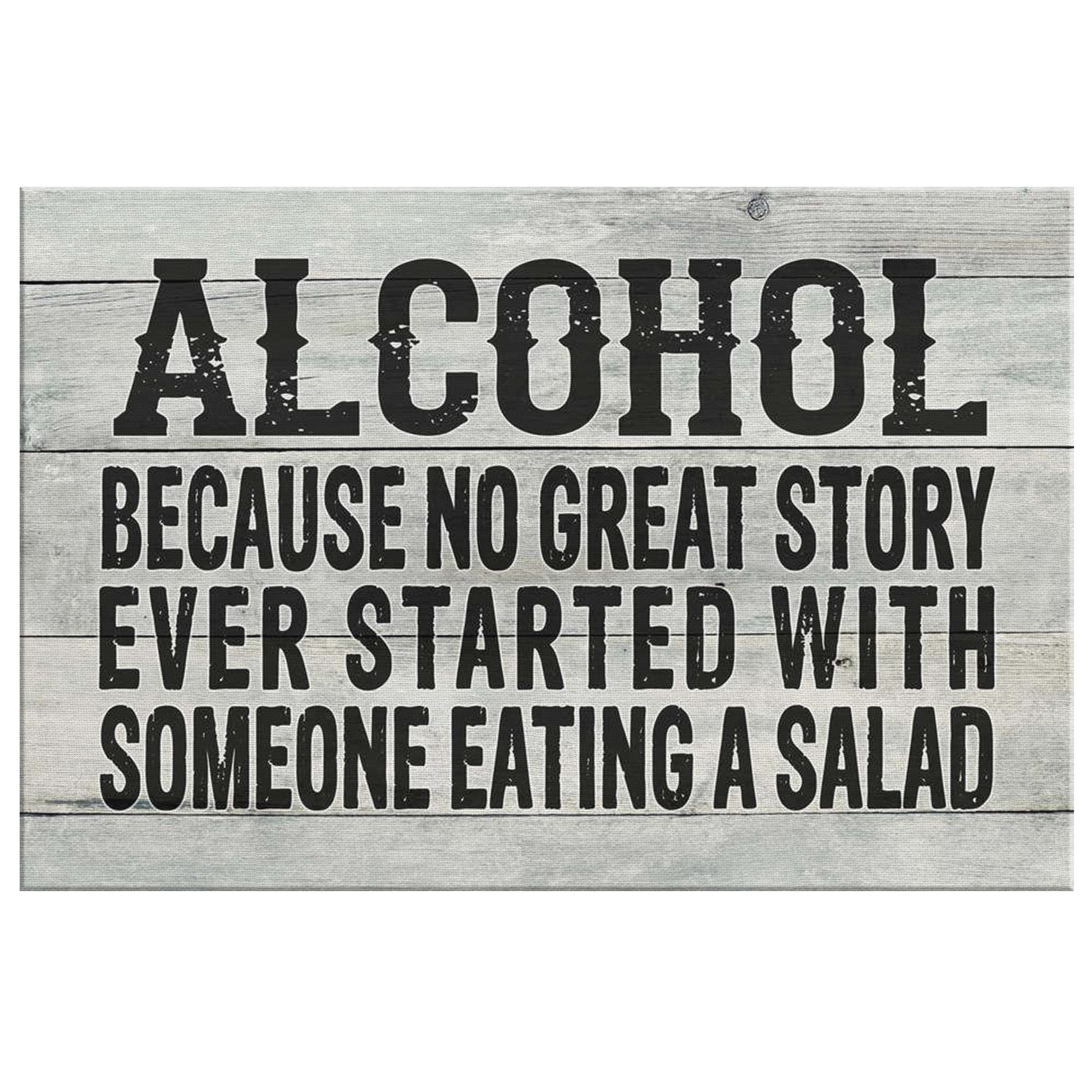 "Alcohol because no great story ever started with someone eating salad" Quote on a beautiful wooden image backdrop square canvas. What a fantastic wall art for a family home this year!