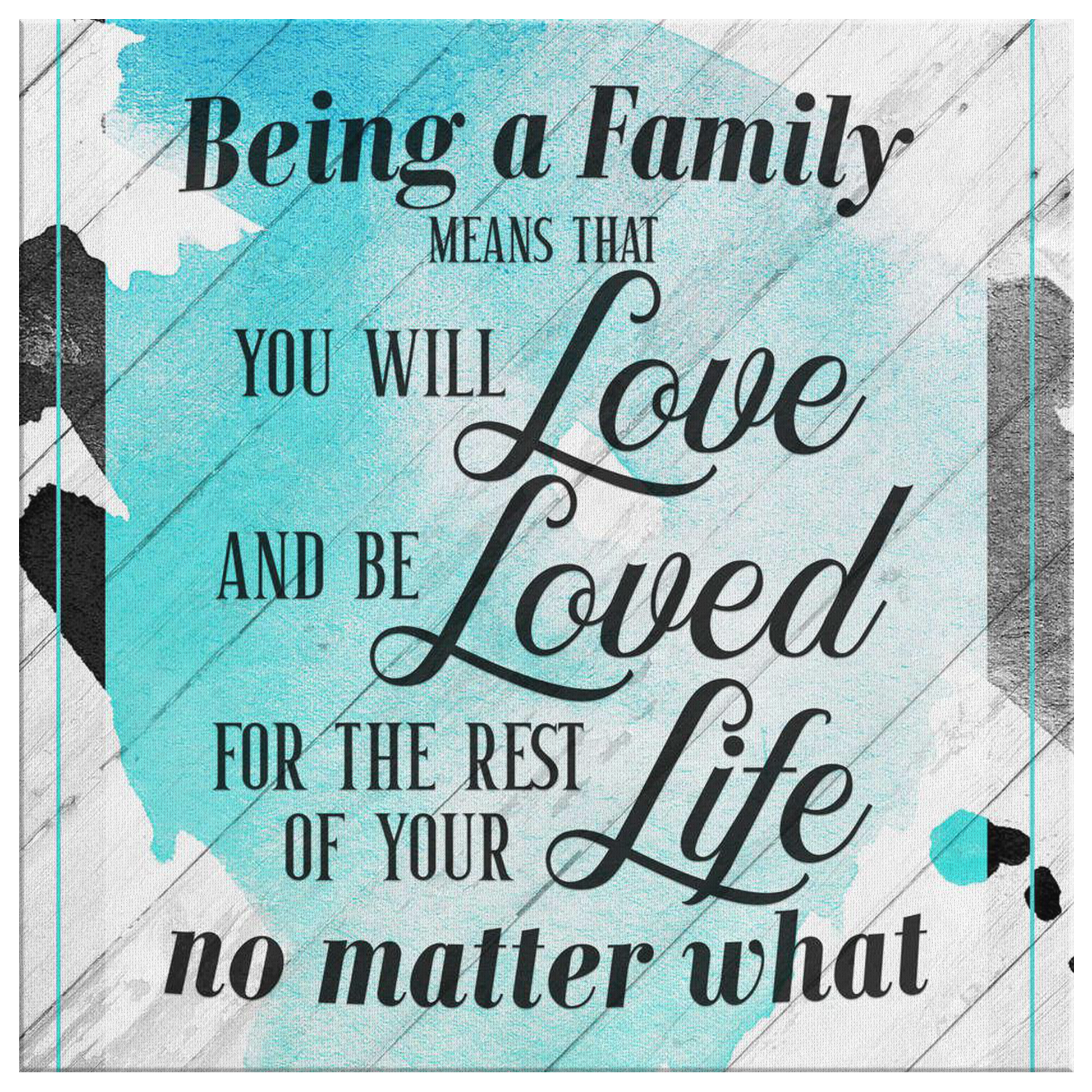 "Being a Family Means that You will Love and Be Loved No Matter What For the Rest of Your Life" Quote on a beautiful light wood and teal image backdrop square canvas. What a fantastic gift for a family home this year!