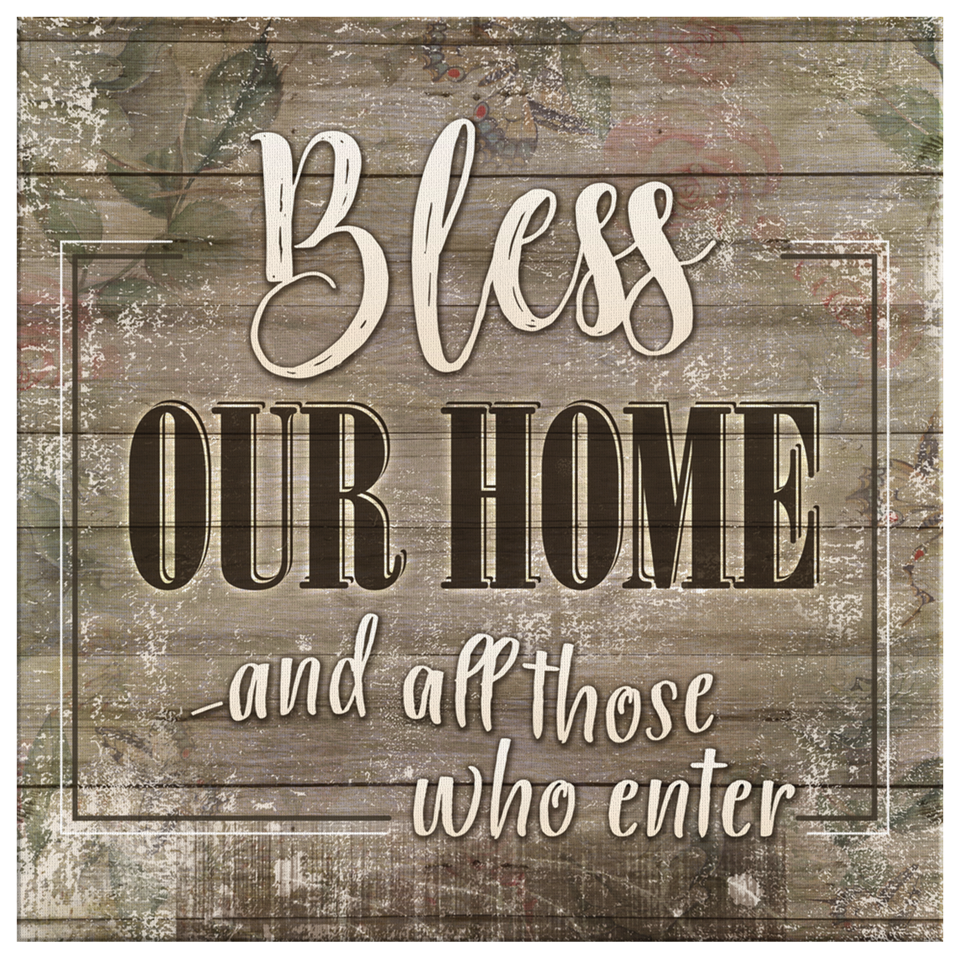 "Bless Our Home And All Those Who Enter" Quote on a beautiful wooden image backdrop canvas. What a fantastic gift for a family home this year!