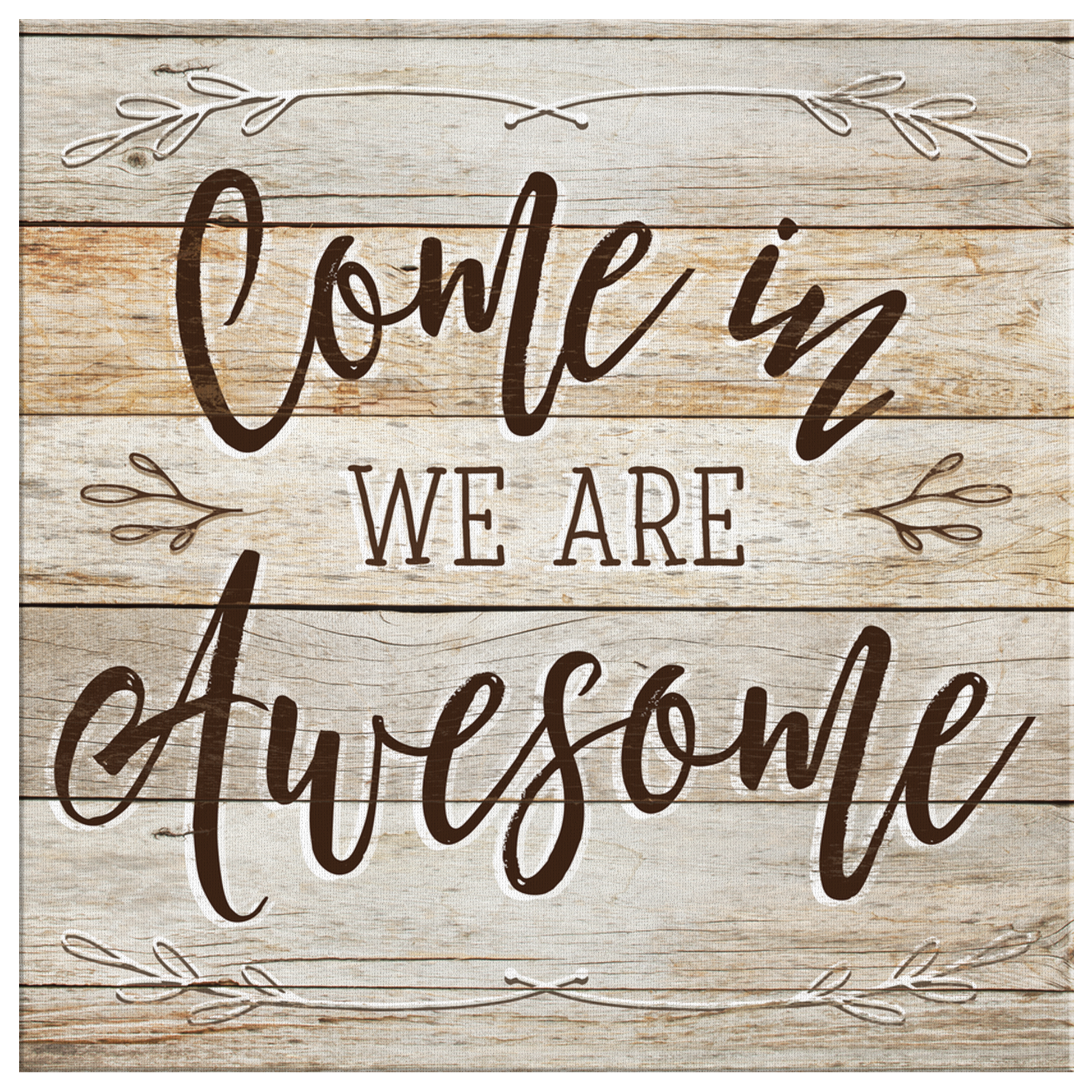 "Come In, We Are Awesome" Quote on a beautiful light wooden image backdrop square canvas. What a fantastic wall art for a family home this year!