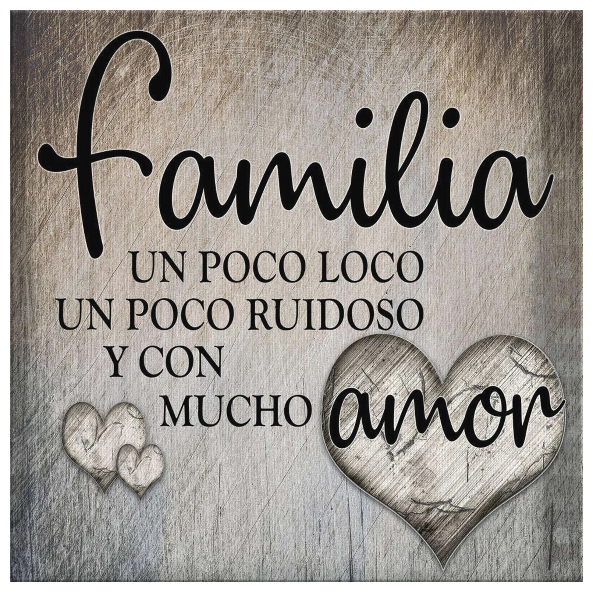 "Familia - Un Poco Loco - Un Poco Ruidoso - Y Con Mucho Amor" Quote on a beautiful wooden image backdrop square canvas.