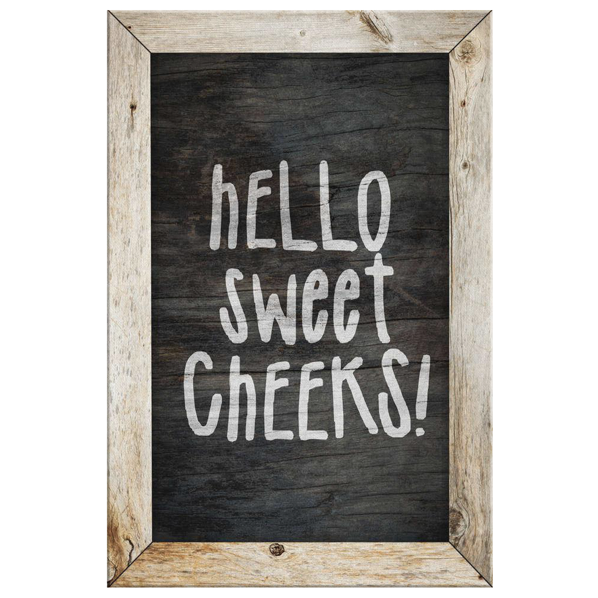 "Hello Sweet Cheeks" Quote on a beautiful wooden image premium printed canvas. Perfect wall art for a bathroom!