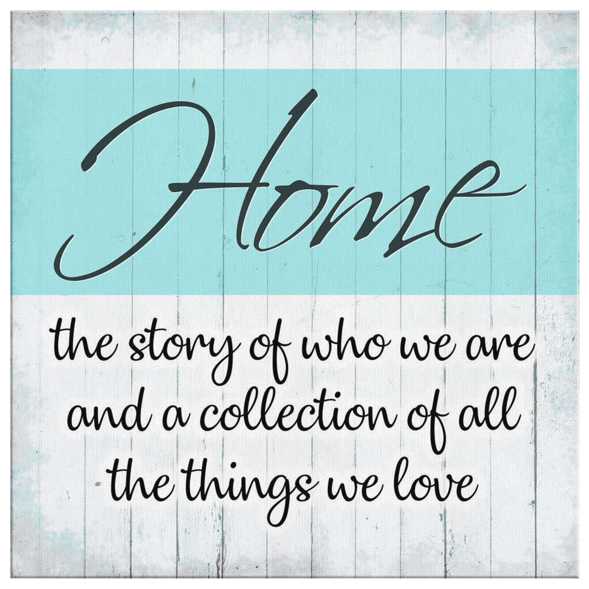 "Home The Story of Who We Are and a Collection of All The Things We Love " Quote on a beautiful light wood and teal image backdrop square canvas. What a fantastic gift for a family home this year!
