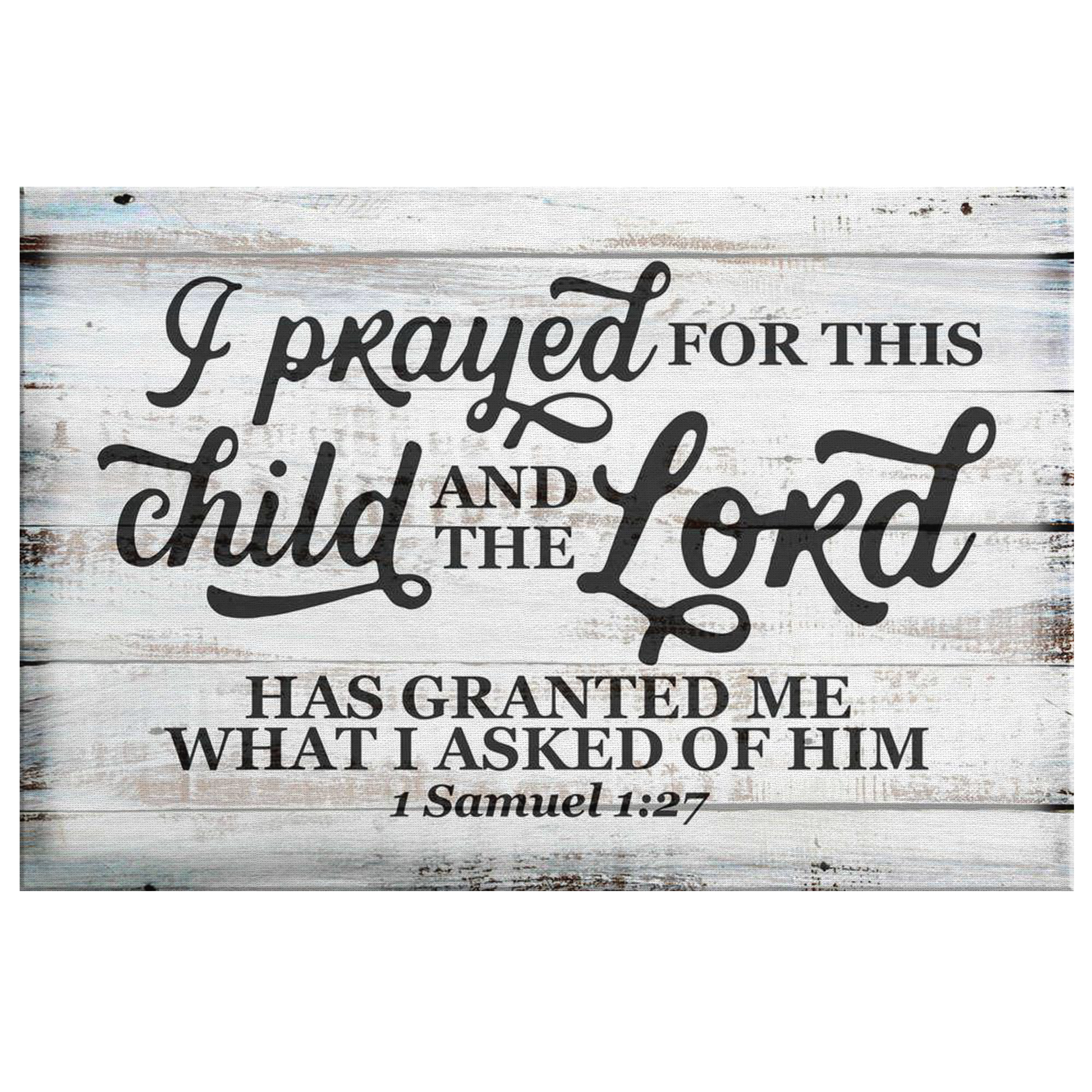 "I Prayed For This Child and The Lord Has Granted Me What I asked of Him 1 Samuel 1:27" Quote on a beautiful wooden image backdrop canvas. What a fantastic gift for a family home this year!