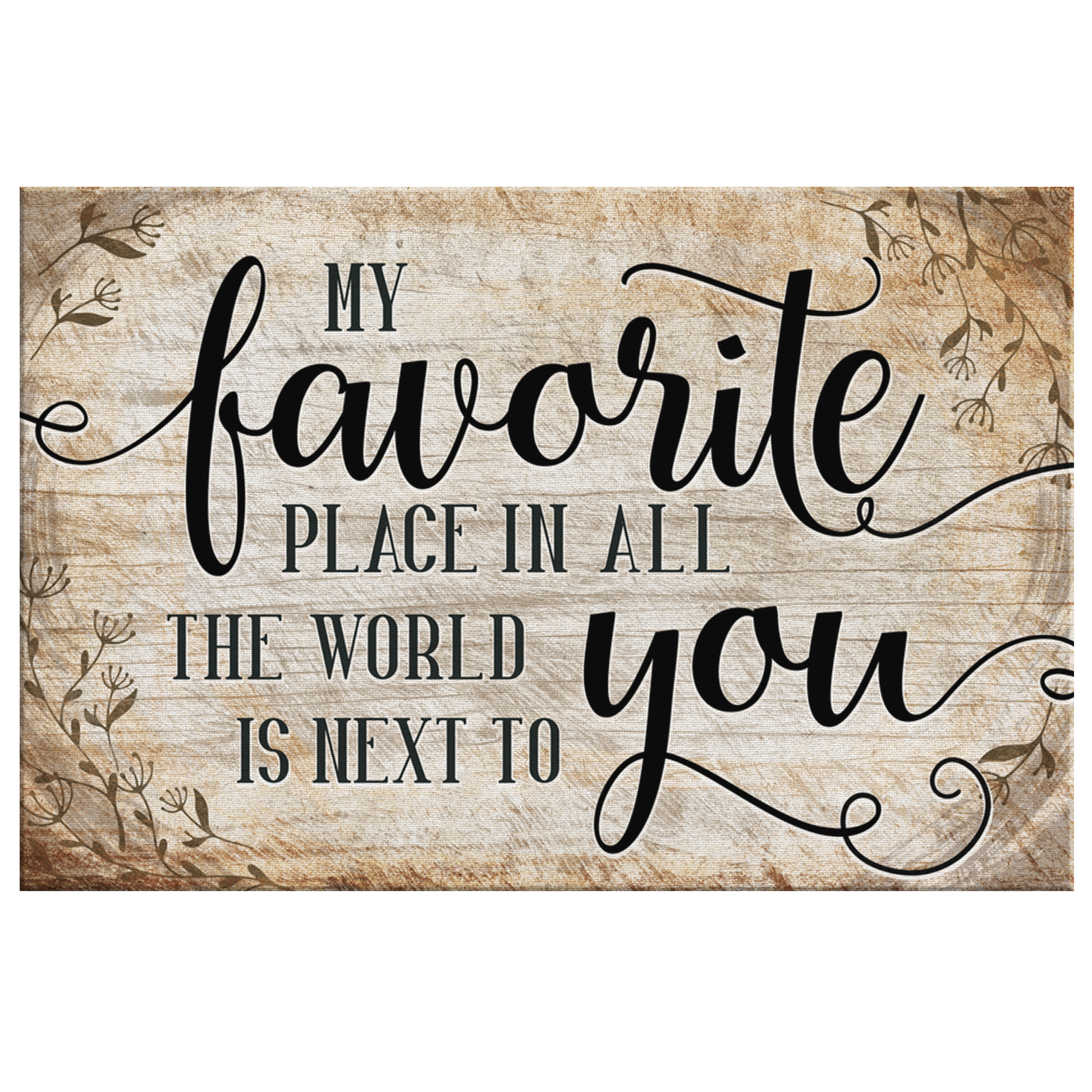 "My favorite place in all the world is next to you." Quote on a beautiful wooden image backdrop premium printed canvas. What a fantastic gift for a loved one this year!