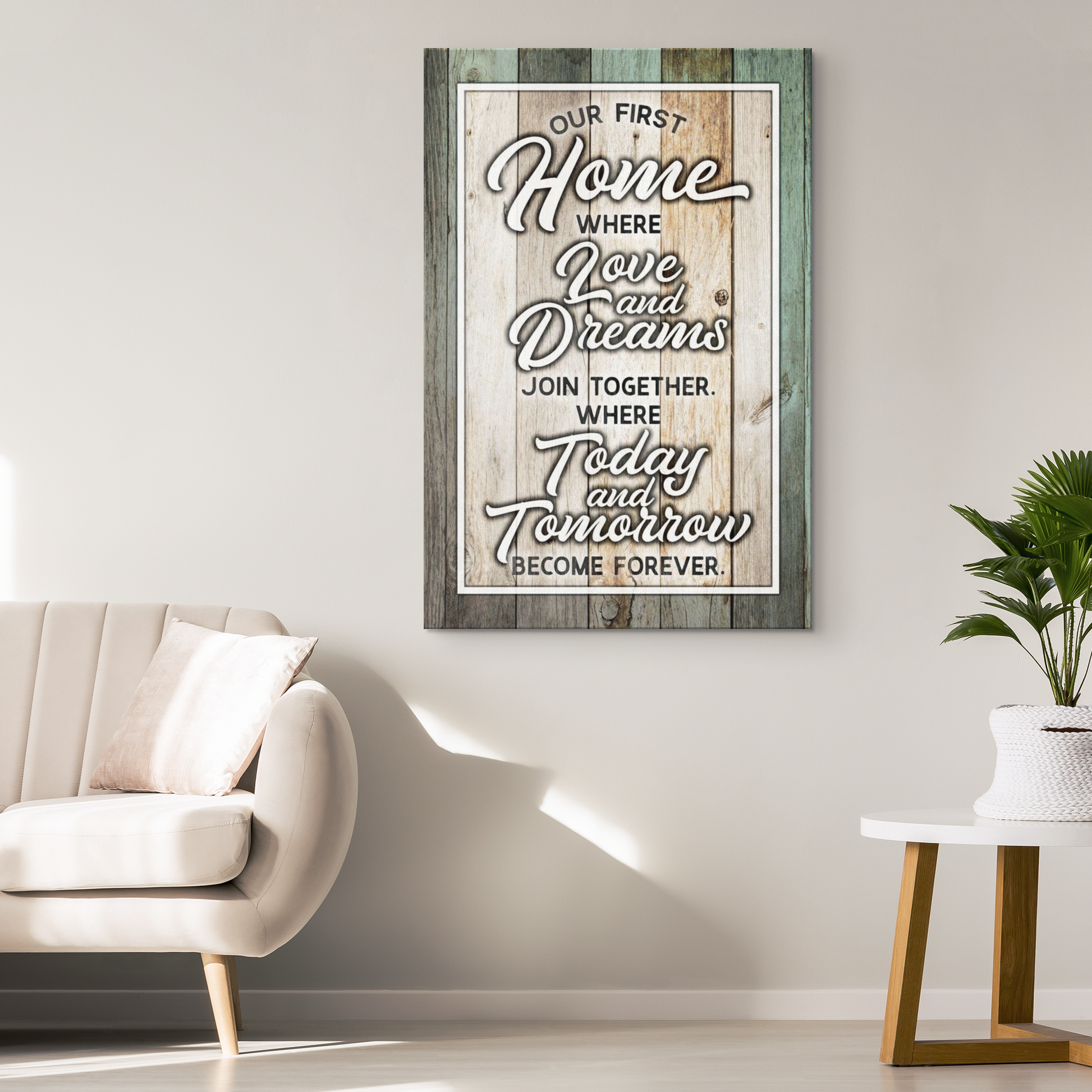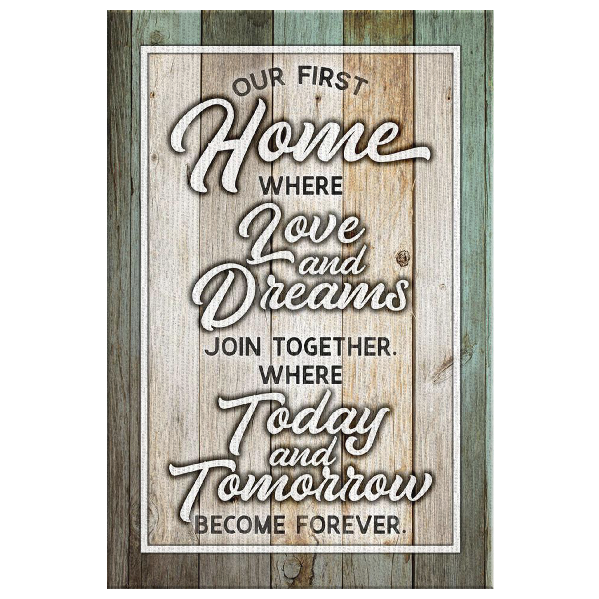 "Our First Home Where Love and Dreams Join Together, Where Today and Tomorrow Become Forever" Quote on a beautiful wooden image backdrop, premium printed canvas.
