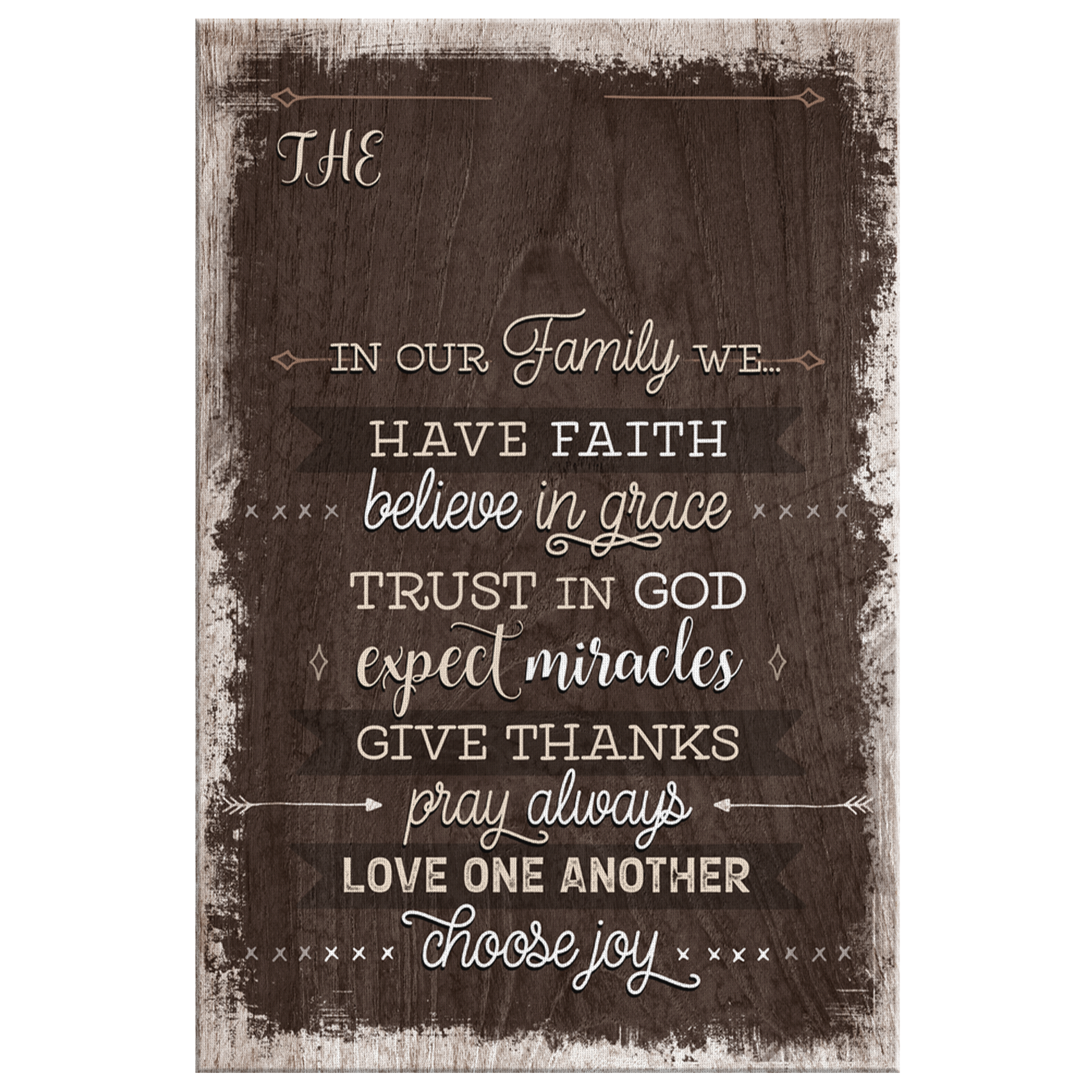 "The ____ Family. In our family we have faith, believe in grace, trust in God, expect miracles, give thanks, pray always, love another, choose joy" Quote on a beautiful wooden image backdrop, premium printed canvas.