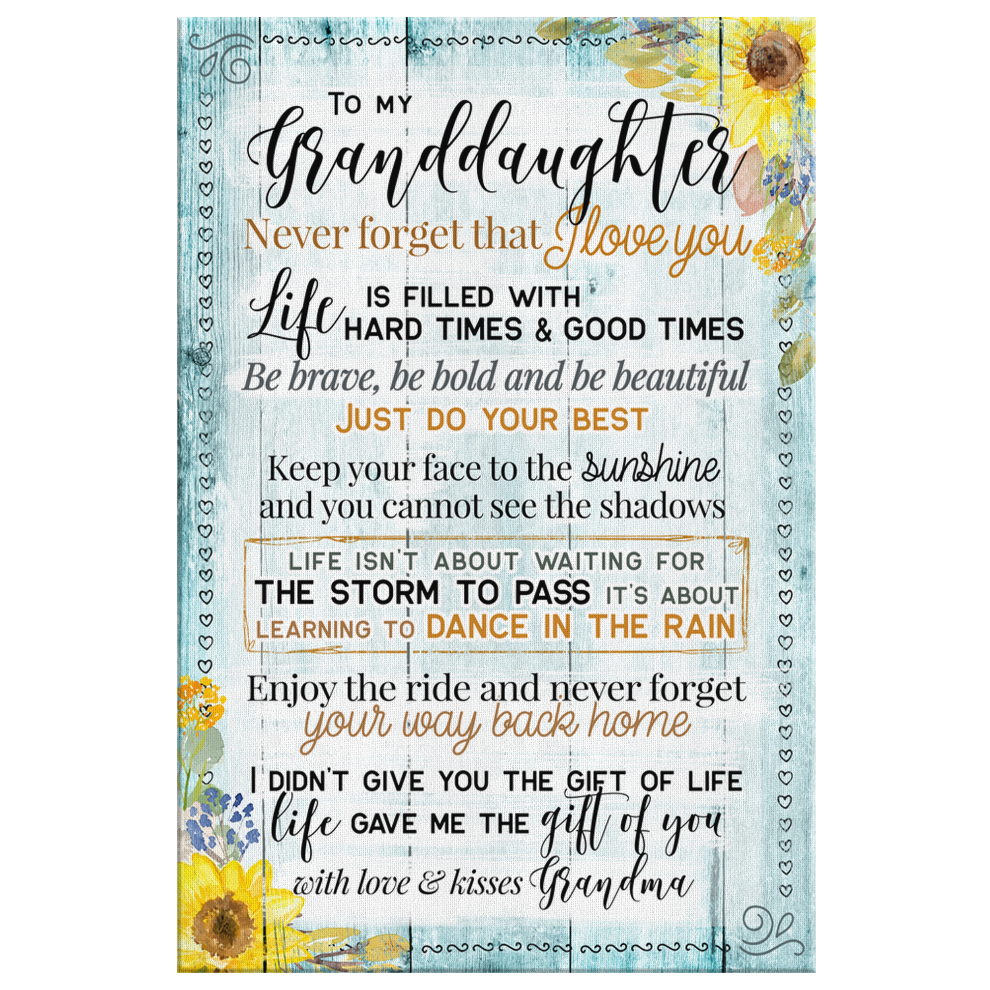 "To my granddaughter. Never forget that I love you. Life is filled with hard times and good times. Be brave, be bold and be beautiful. Just do your best. Keep your face to the sunshine and you cannot see the shadows. Life isn't about waiting for the storm to pass. It's about learning to dance in the rain. Enjoy the ride and never forget your way back home. I didn't give you the gift of life. Life gave me the gift of you. With love and kisses. Grandma. " Quote on a beautiful teal, wooden image backdrop, premium printed canvas.