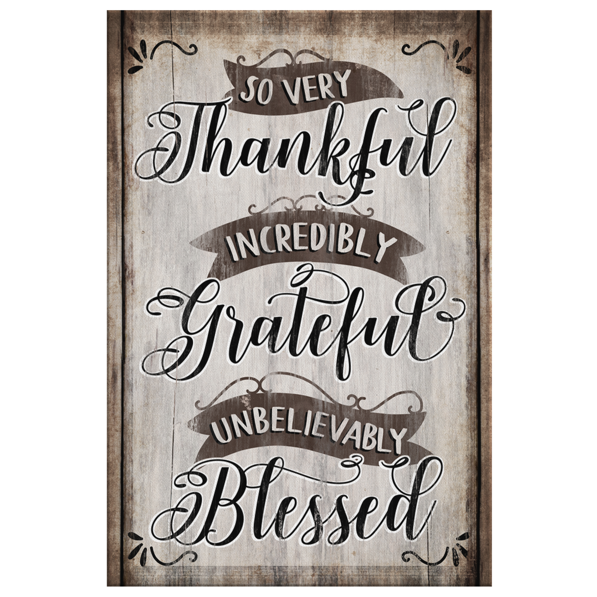 "So very thankful. Incredibly grateful. Unbelievably blessed." Quote on a beautiful wooden style rustic backdrop printed on a premium canvas. What a fantastic gift for a family home this year!