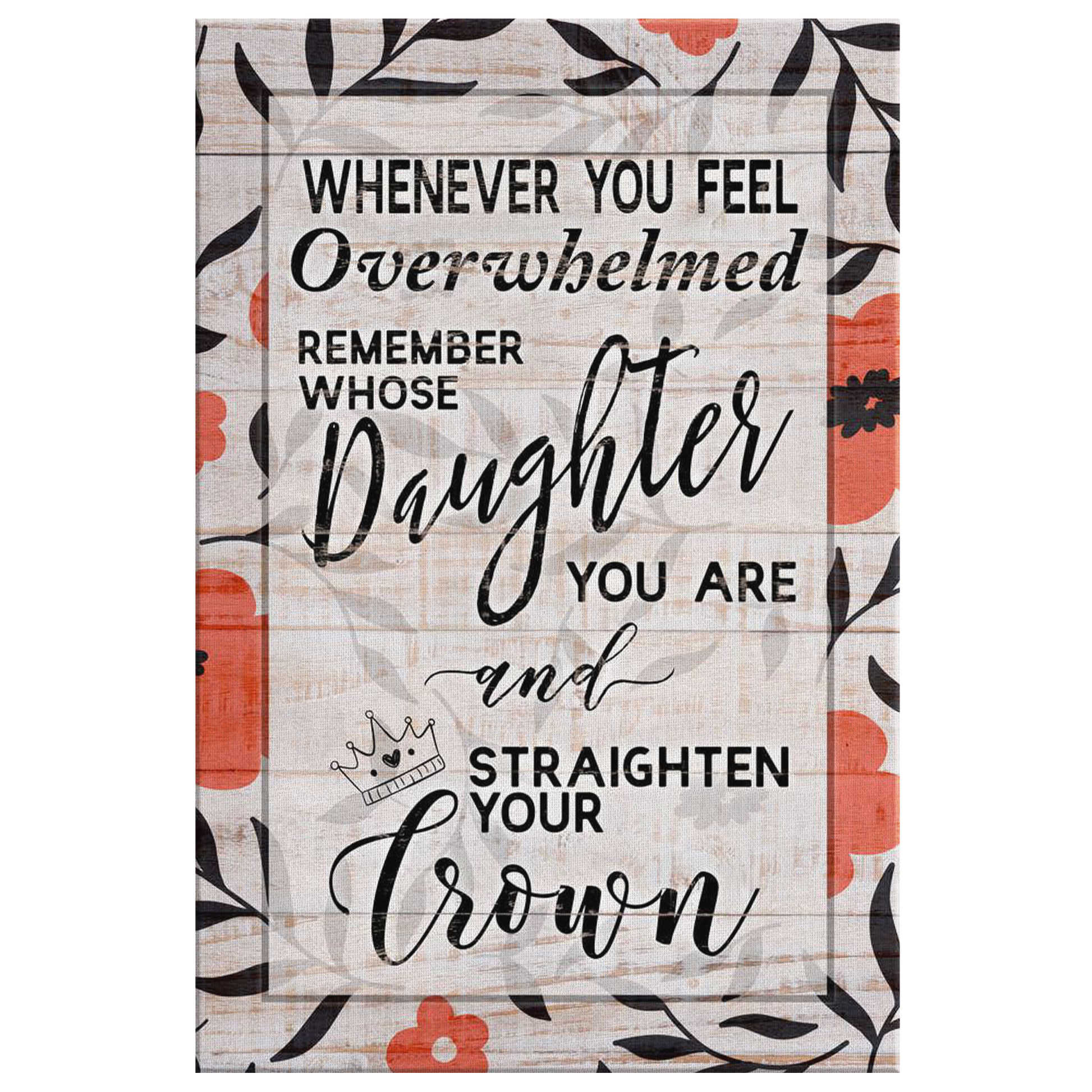 "Whenever You Feel Overwhelmed Remember Whose Daughter You Are And Straighten Your Crown" Quote on a beautiful wooden image backdrop canvas.
