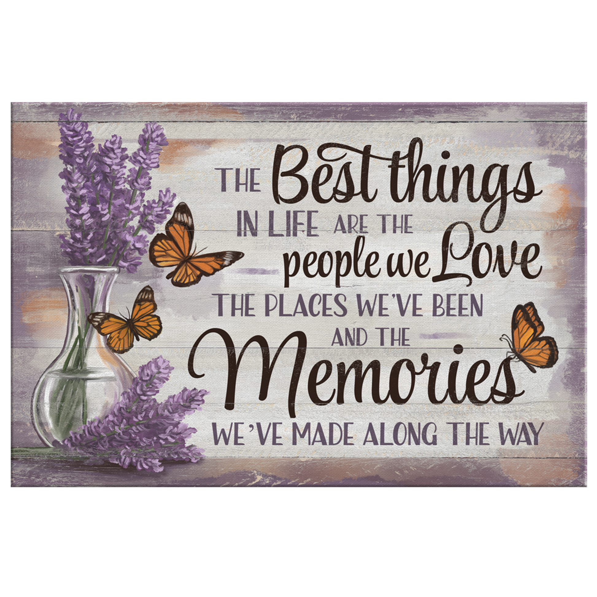 "The best things in life are the people we love the places we've been and the memories we've made along the way." Quote with a beautiful lavender and butterfly, wooden image backdrop, on a premium printed canvas. What a fantastic piece for a loved one this year!