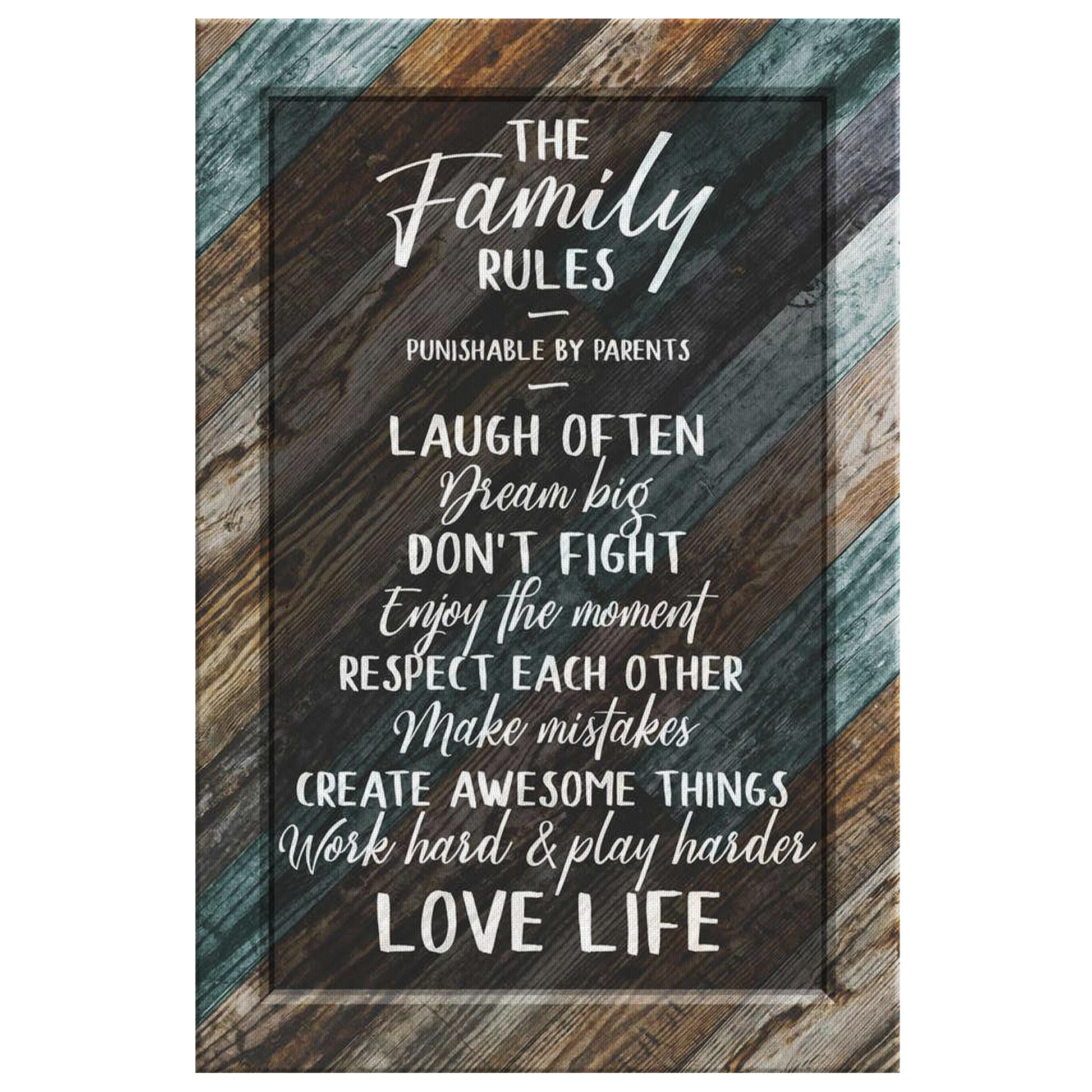 "The Family Rules - Punishable by Parents Laugh Often Dream Big Don't Fight Enjoy the Moment Respect Each Other Make Mistakes Create Awesome Things Work Hard & Play Harder Love Life" Quote on a beautiful wooden image backdrop, premium printed canvas. What a fantastic gift for a family home this year!