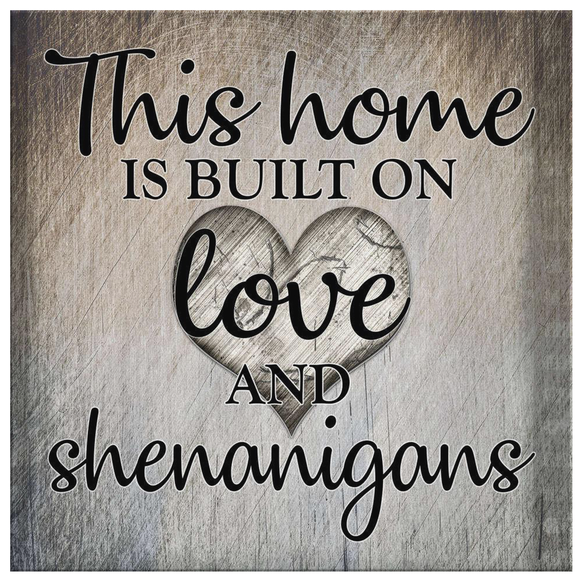 "This Home Is Built On Love and Shenanigans" Quote on a beautiful wooden image backdrop, premium printed canvas. Buyers are loving this!