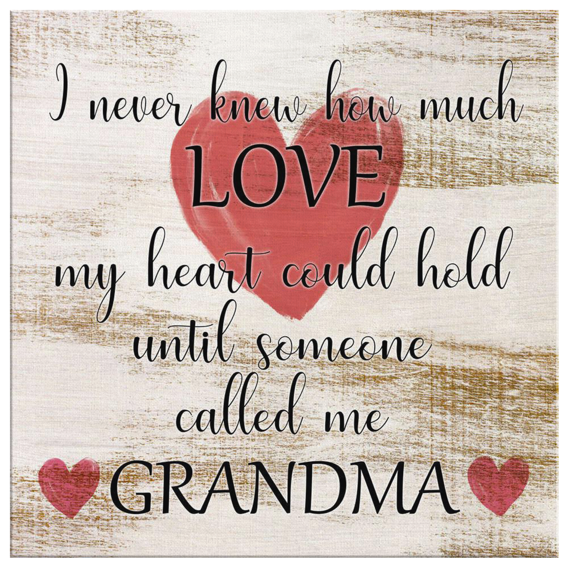 "I never knew how much love my heart could hold until someone called me Grandma" Quote on a beautiful red heart and wooden image backdrop, premium printed canvas.