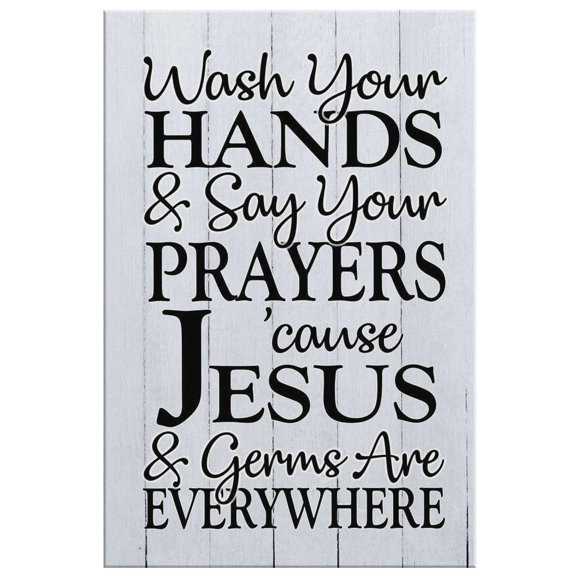 "Wash Your Hands & Say Your Prayers 'Cause Jesus and Germs are Everywhere" Bathroom piece on a beautiful whitewash wooden image backdrop canvas.