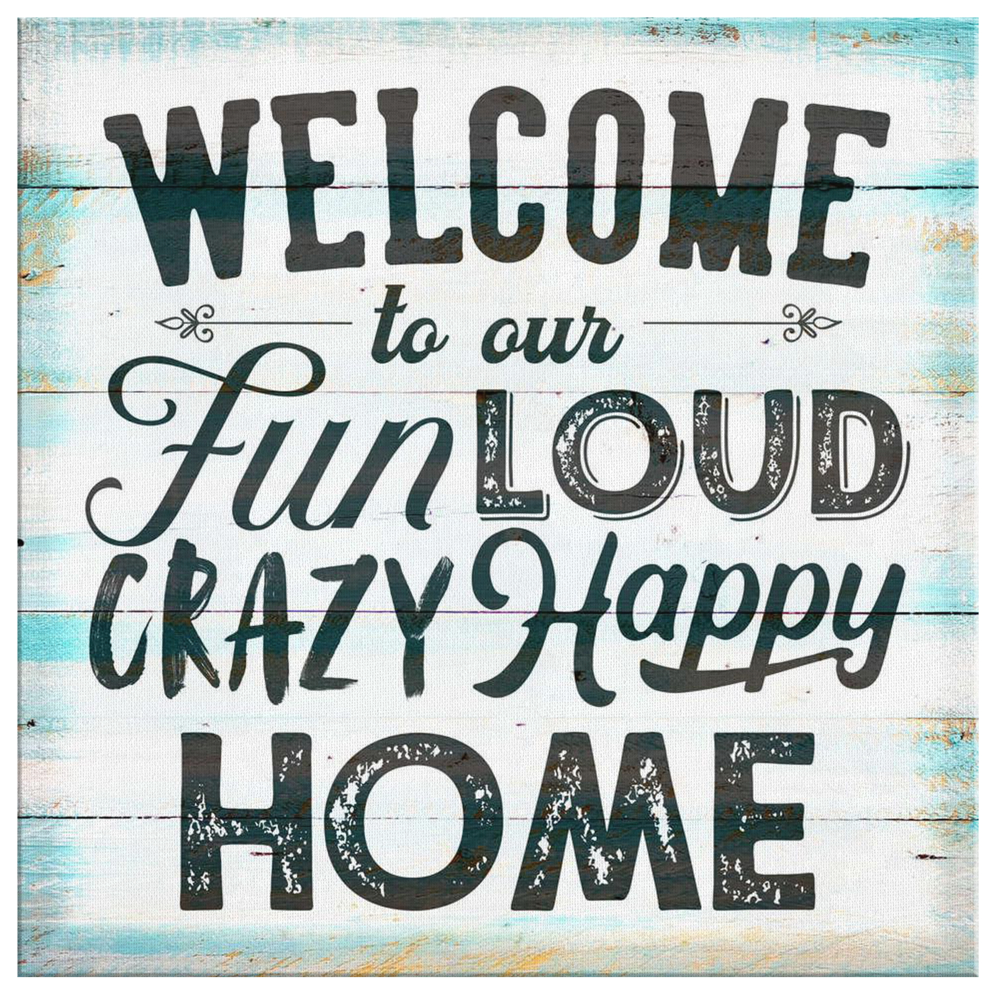 "Welcome to Our Fun Loud Crazy Happy Home" Quote on a beautiful wooden image backdrop, premium printed canvas. What a fantastic gift for a family home this year!